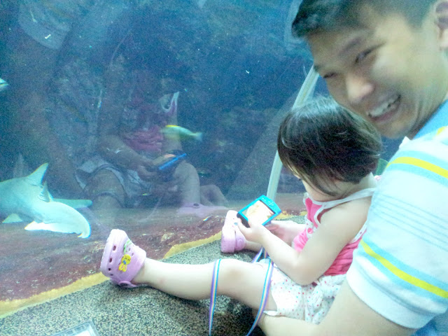 Le Xin is usually nonchalant about me taking photos of her........she is so used to me doing that since she knows I used it for her documentation. In fact, I often show her this blog and read the entries to her.... However, for our trip to Underwater World, she suddenly displayed an interest in wanting to use my camera. I knew I had to pass it to her for her to try bur frankly speaking in my heart, I was really afraid she might drop it haha :) Here's Daddy Scott teaching Le Xin how to operate my camera :)
