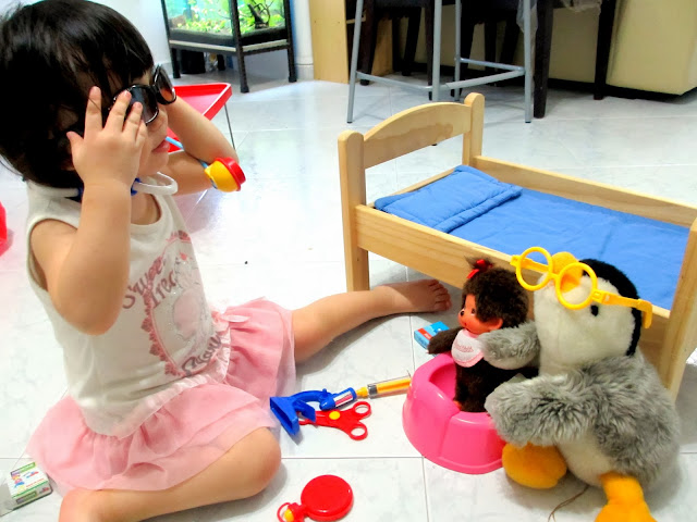 Children who spent a lot of time in dramatic play, literally put themselves in someone's else shoes thus helping them to be more emphatic in real life, it's like imagining how someone else is feeling. Here's a great example of Le Xin playing at her housekeeping corner at home.