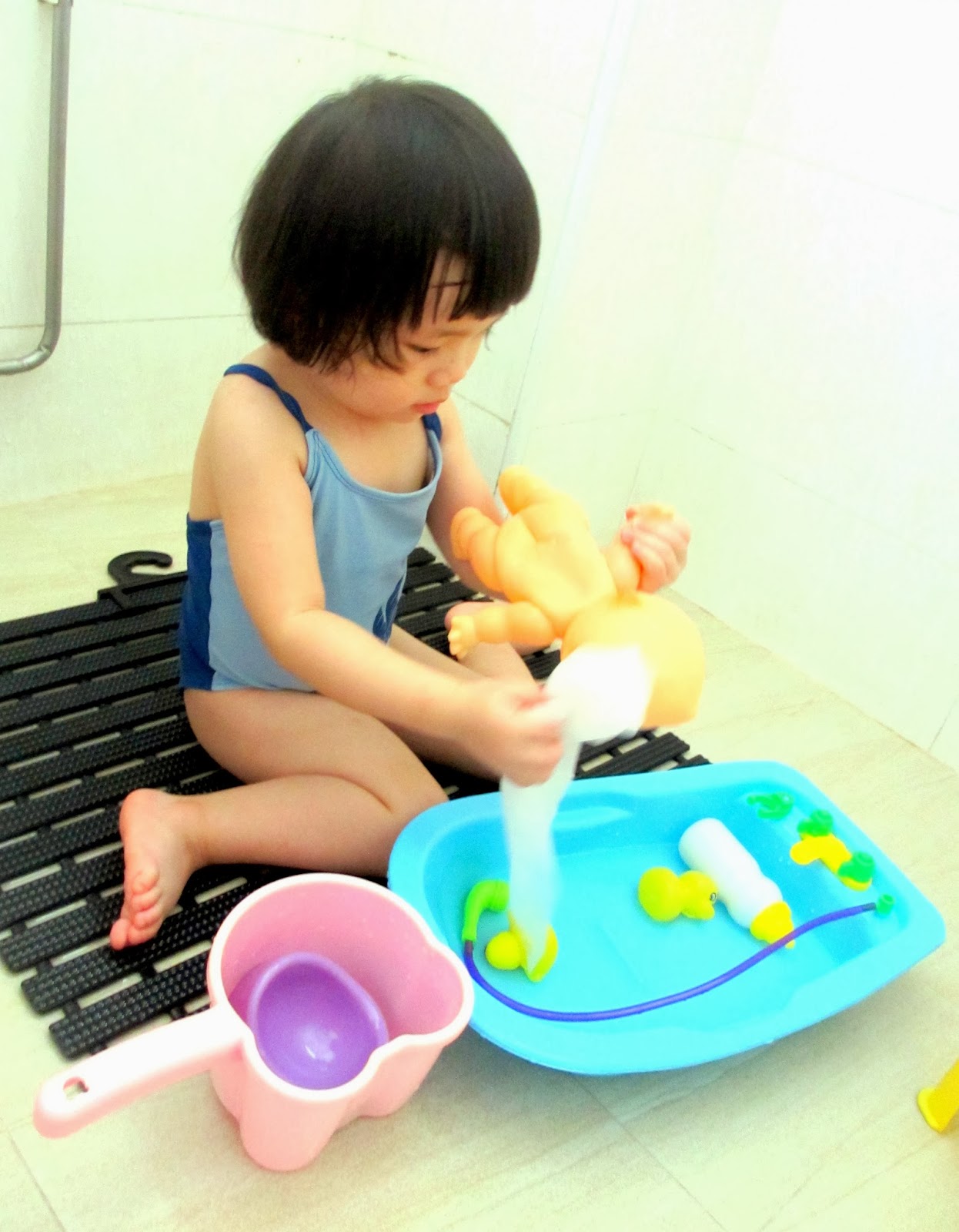 Here's a detailed observation of how Le Xin bathed her doll in one of her play. I thought she was quite meticulous about some of the details when bathing her "baby".